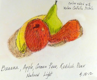 While watching the Tigers/Red Wings yesterday after we got home, I set up my plastic fruit in the living room and did a quick sketch - later I added some pastel to it. They are much messier than I expected. They are some of the art supplies I acquired at an estate sale last year.